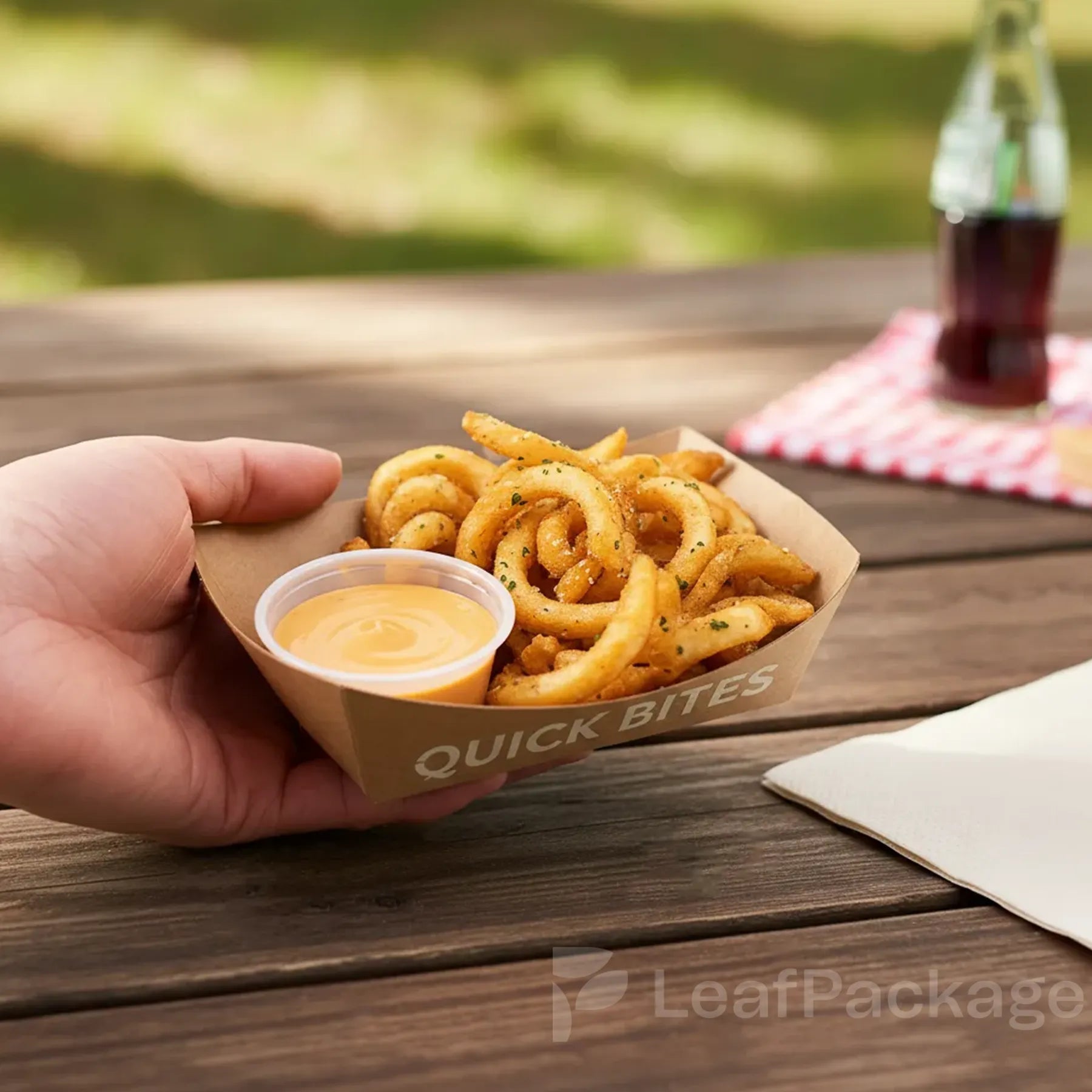 Upgrade your food presentation with LeafPackage custom kraft trays. Crafted from sturdy kraft paper and FDA-certified for safety, these trays feature oil-resistant performance and support offset printing for eye-catching designs. Perfect for snacks, street food, and casual bites, they combine practical durability with eco-friendly branding—ideal for small businesses who want packaging that speaks as boldly as their flavors.