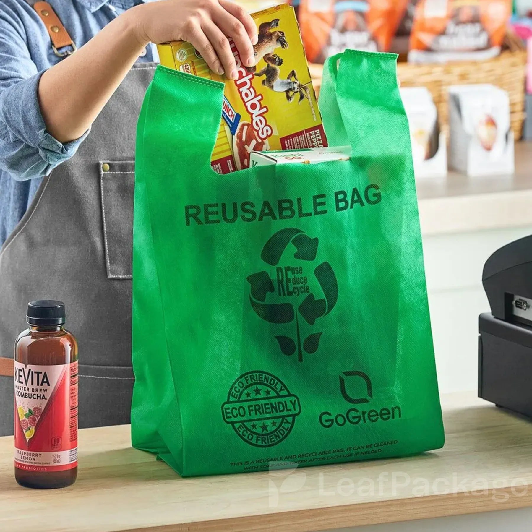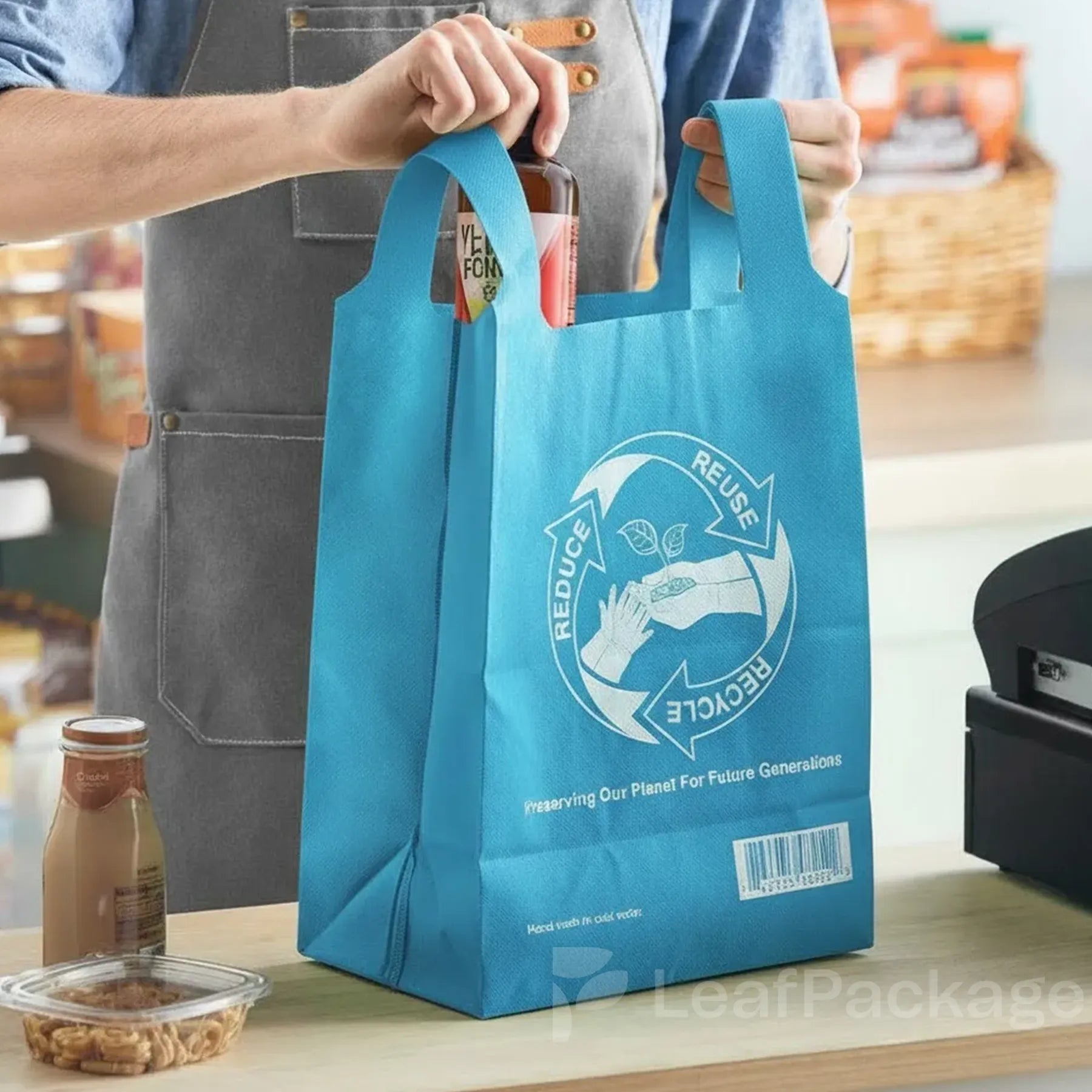 Design your own eco reusable non-woven T-shirt bags with custom logo printing. Ideal for small businesses, sustainable packaging, and retail stores.