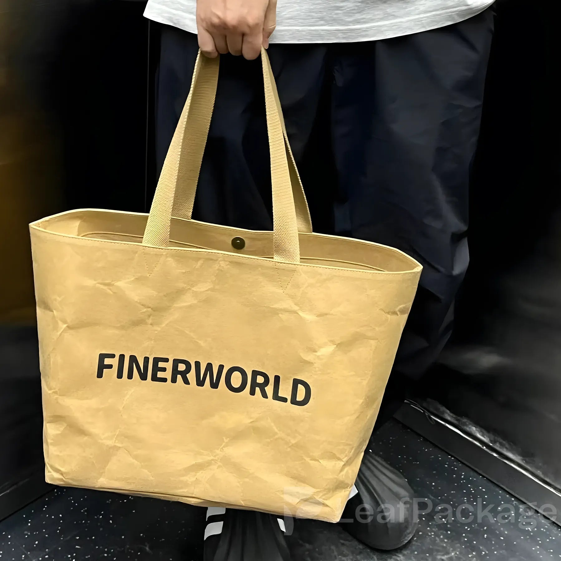 Custom washable kraft paper tote with eco-friendly, durable design. Perfect for small business branding, sustainable packaging, and low MOQ custom orders.